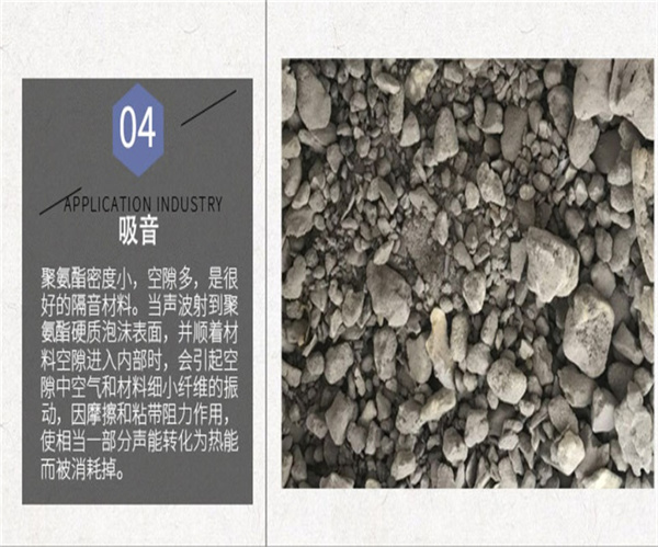 4.吸音:聚氨酯密度小,空隙多,是很好的隔音材料。当声波射到聚氨酯硬质泡沫表面,并顺着材料空隙进入内部时,会引起空隙中空气和材料细小纤维的振动,因摩擦和粘带阻力作用,使相当一部分声能转化为热能而被消耗掉。